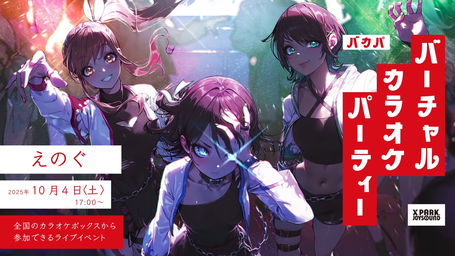 株式会社エクシング(本社:名古屋市瑞穂区、代表取締役社長:水谷靖、以下「エクシング」)は、株式会社パノラプロ(東京都千代田区、代表取締役社長:広田稔)と連携し、「JOYSOUND」が展開するエンターテインメント・プラットフォーム「X PARK」を活用して、全国のカラオケルームから、まるで推しのVTuberと一緒にカラオケパーティーをしているような臨場感を味わえる、新しい形のライブイベント「バーチャルカラオケパーティー」を開催します。その第一弾として、10月4日(土)、バーチャルアイドル「えのぐ」のライブの開催が決定しました。