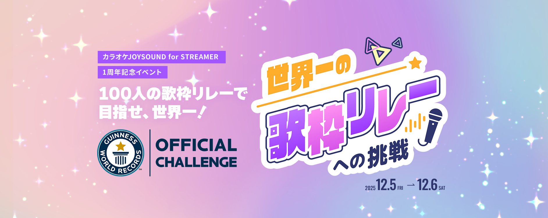 そんな「カラオケJOYSOUND for STREAMER」の1周年を記念して開催する今回のイベントでは、「歌枠」をつないでいく『歌枠リレー』を、総勢100名の出演者によって実施します。12月5日(金)18時より、各出演者が15分ずつ交代でYouTubeの活動チャンネルにて歌枠を配信。100名のリレーが見事完結した場合には、「生配信のカラオケ歌枠リレーイベントに参加した最多人数(Most participants in a livestreamed karaoke relay event)」のギネス世界記録™へのチャレンジ認定を受け、世界一の歌枠リレーとして登録される見込みです。