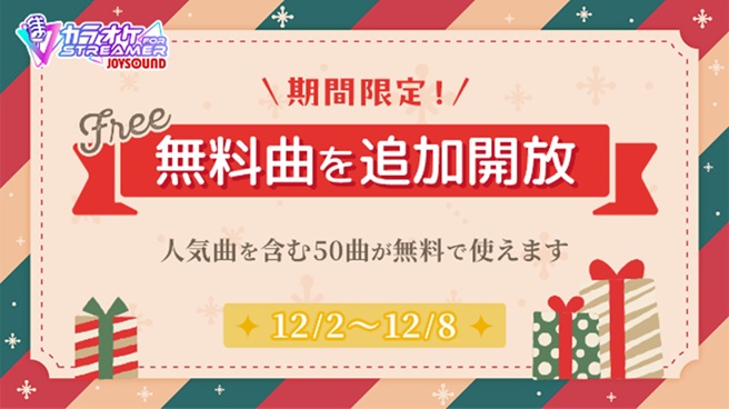 出演者は、企業VTuberプロジェクトをはじめ、KADOKAWA CSP、Game8からの出演に加え、日頃サービスをご利用いただいているユーザーの皆様の出演枠もご用意しました。なお、本イベント開催に伴い、12月2日(火)~12月8日(月)の期間中は、従来のお試し曲に加えて、カラオケ人気曲20曲を始めとした全50曲を無料で追加開放!普段から本サービスをご愛用いただいている皆さまはもちろん、カラオケを活用した配信に挑戦してみたいという方でも、気軽にご応募いただけます。まだサービスをご利用されていない方も、この機会にぜひ、無料でカラオケ配信をお楽しみください。