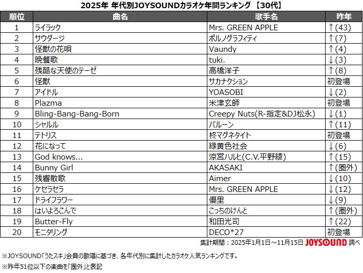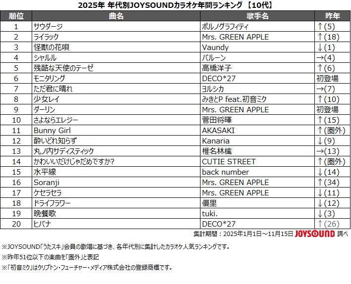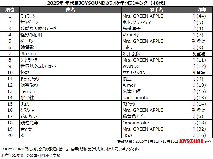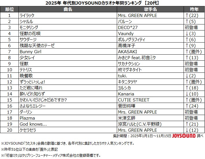 JOYSOUNDが、カラオケ年間ランキングの世代ギャップを徹底解剖!20~40代はMrs. GREEN APPLE「ライラック」がトップ、10代はなんと25年前の名曲が1位に。