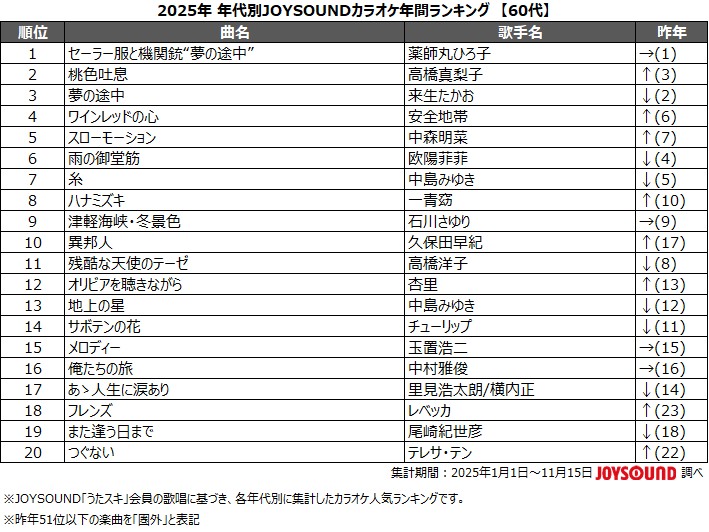 長年愛されている往年の名曲に加え、最新の音楽トレンドの楽曲も取り入れている50代。3年連続の1位を獲得したのは、薬師丸ひろ子の「セーラー服と機関銃“夢の途中”」。メロディやリズム、音域が比較的安定していて歌いやすいことから、カラオケ採点でも人気の曲となっています。尾崎豊の「I LOVE YOU」や今井美樹の「PIECE OF MY WISH」が昨年の圏外からランクアップし、この年代ならではの楽曲が顔を揃えました。さらに、Mrs. GREEN APPLEの「ダーリン」など、近年のヒット曲もしっかりとカバーしています。