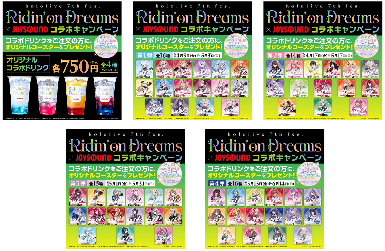 全国の対象カラオケ店舗では、「hololive 7th fes. Ridin’ on Dreams」の各公演をイメージしたオリジナルコラボドリンク(全4種)を展開!第1弾[4月3日(金)~5月3日(日)]では16種、第2弾[4月17日(金)~5月17日(日)]では14種、第3弾[5月1日(金)~5月31日(日)]では15種のオリジナルコースターを、第4弾[5月15日(金)~6月14日(日)]では16種のオリジナルコースターを、1点のご注文につき1枚、特典としてプレゼントします。(ランダム配布となります/絵柄は選べません)また、ホログラム仕様のレアコースターもランダムで封入! (特典コースターはなくなり次第、終了となります。)